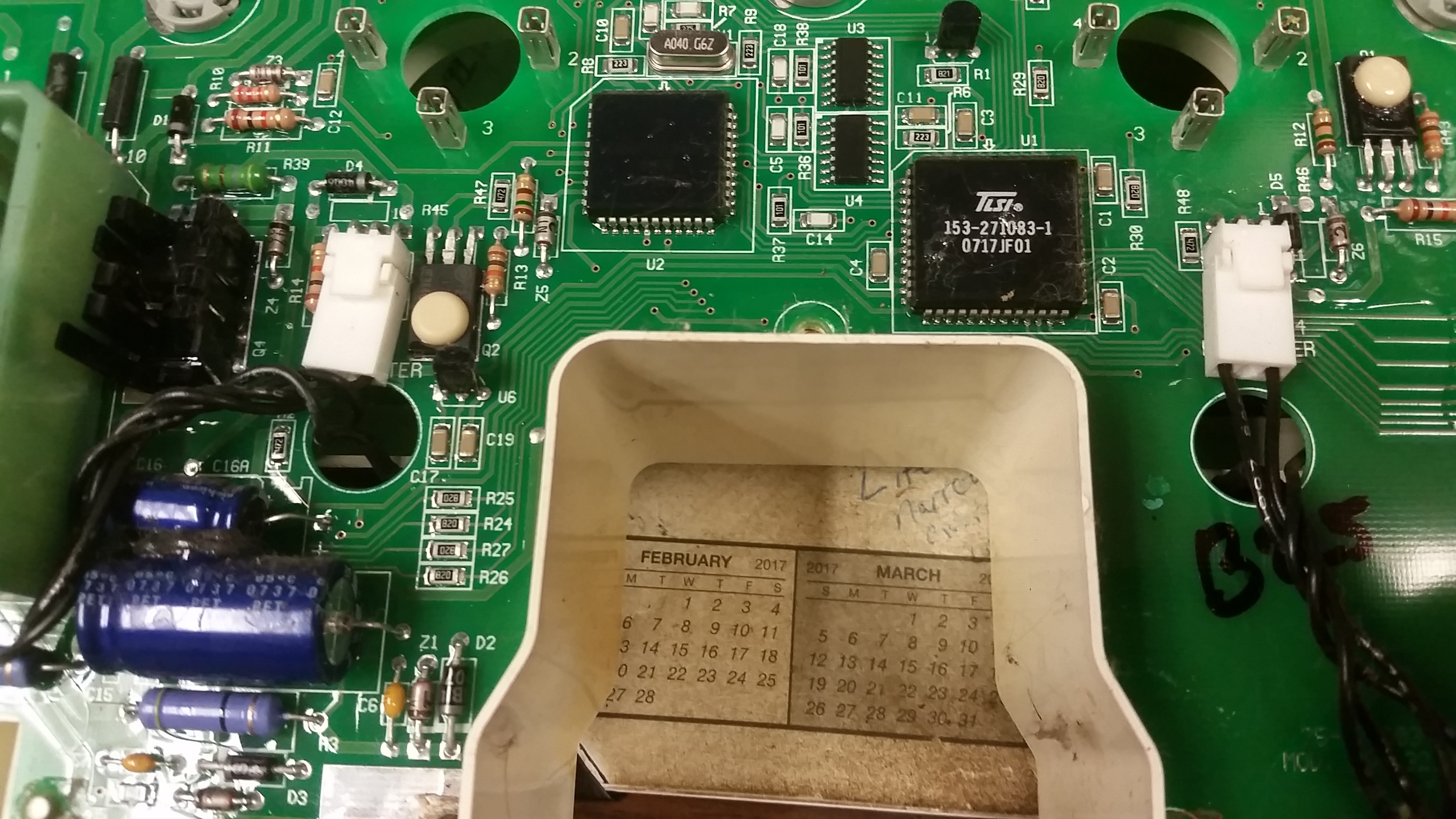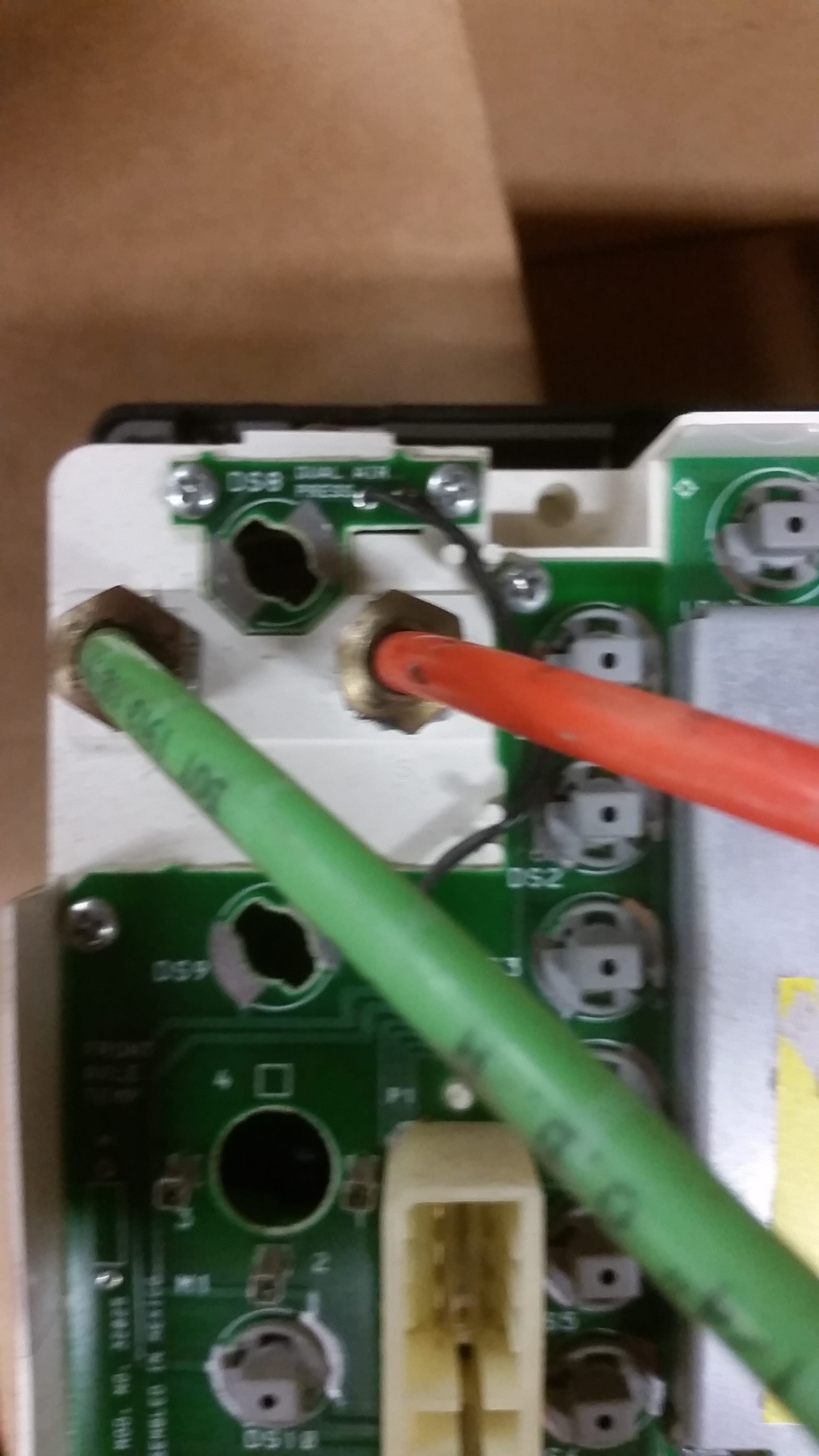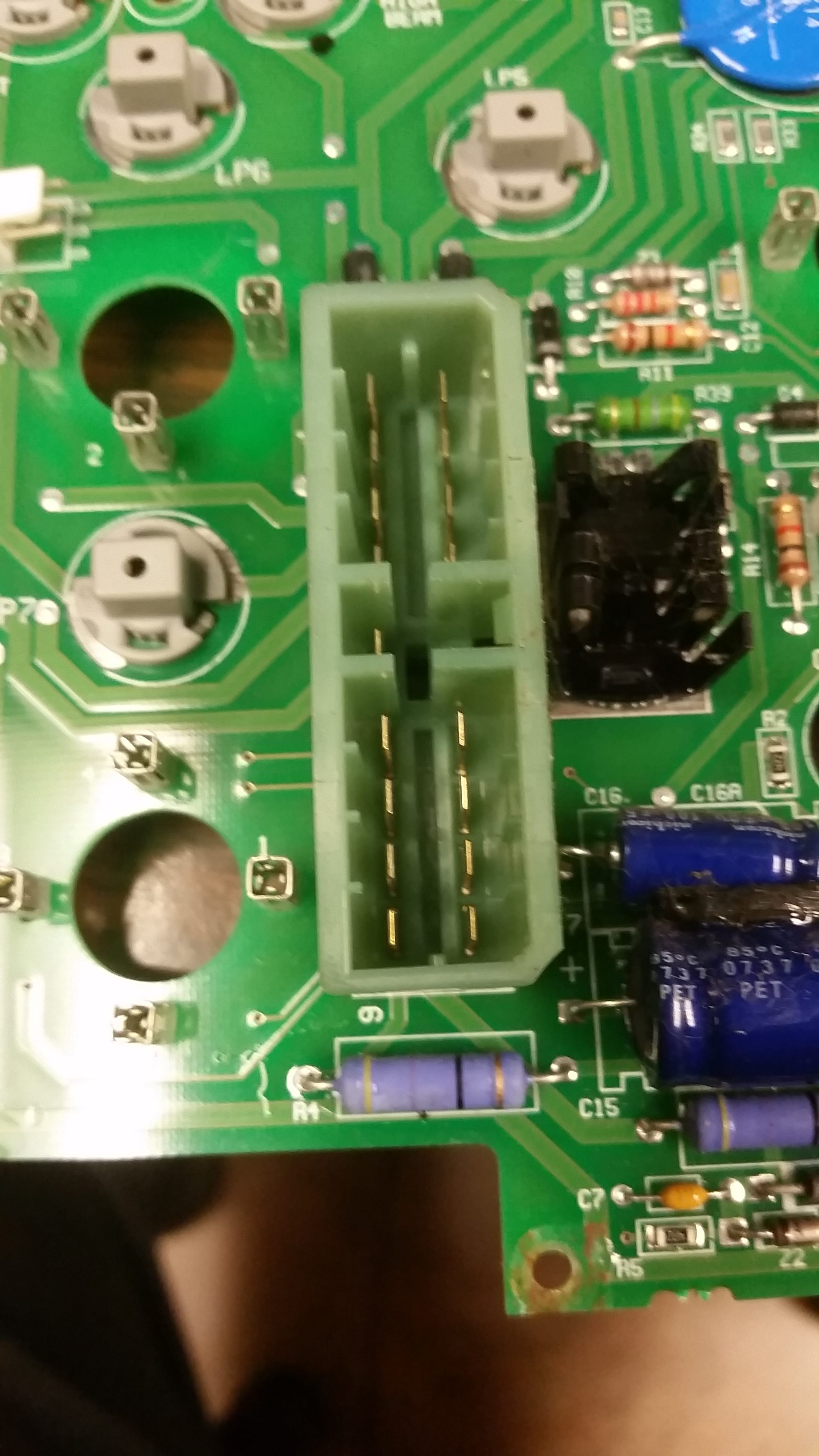 Now that the circuit board is removed it is time to re-solder the connections for the main plug. The pins that you want to re-solder will be the ones opposite of the pins in the green plug on the back side of the circuit board. It doesn’t take much to re-solder them. Heat them up with a soldering iron and then once hot add a tiny bit of new solder and then move on to the next one. If you look in the picture below I have used a sharpie to make a dotted line around the pins that you should re-solder.