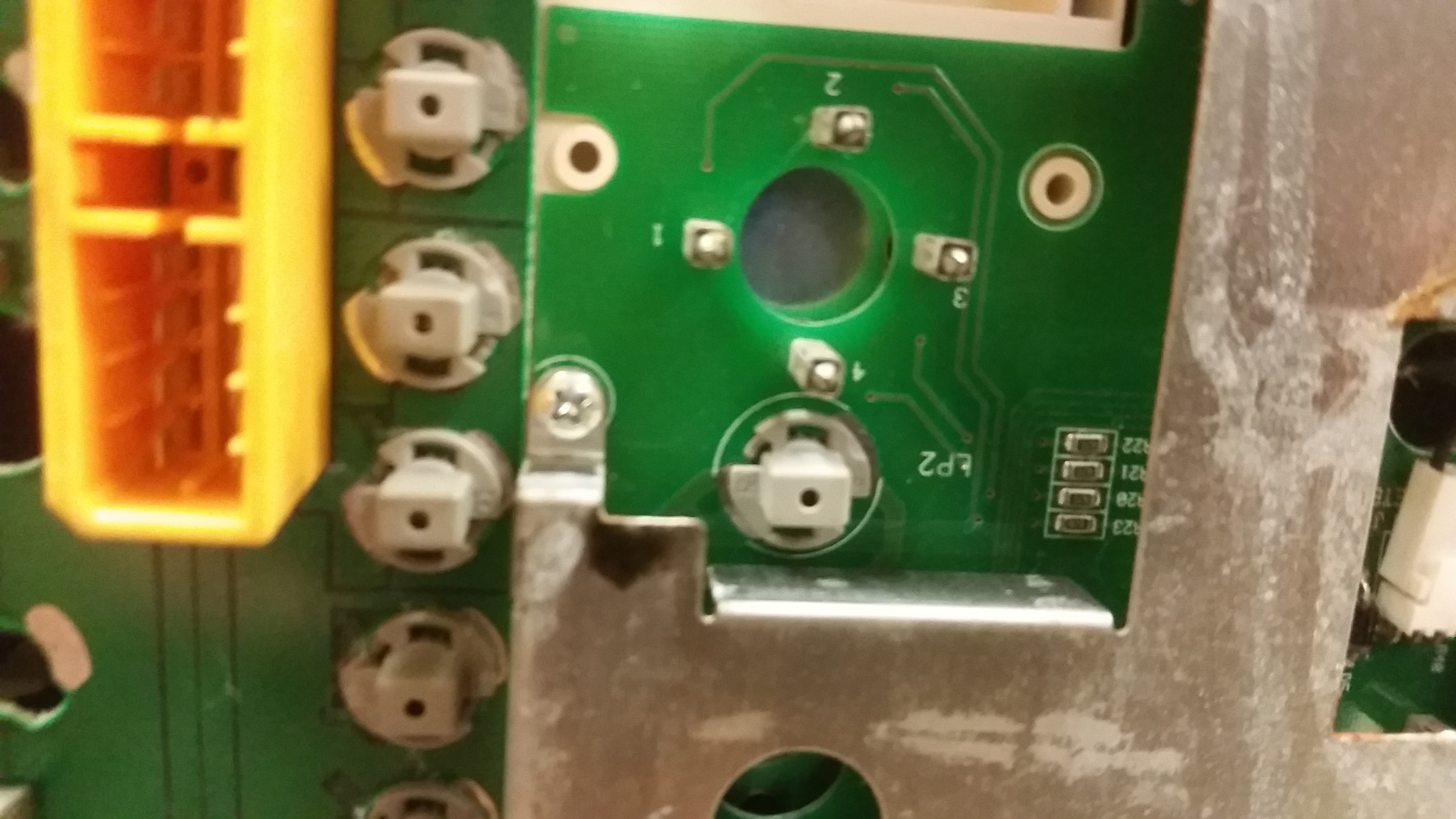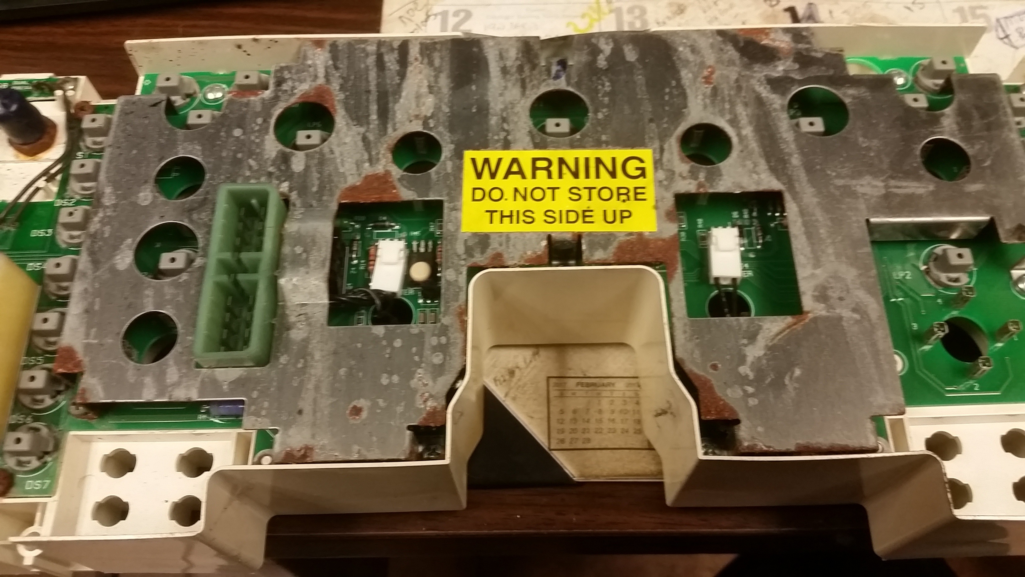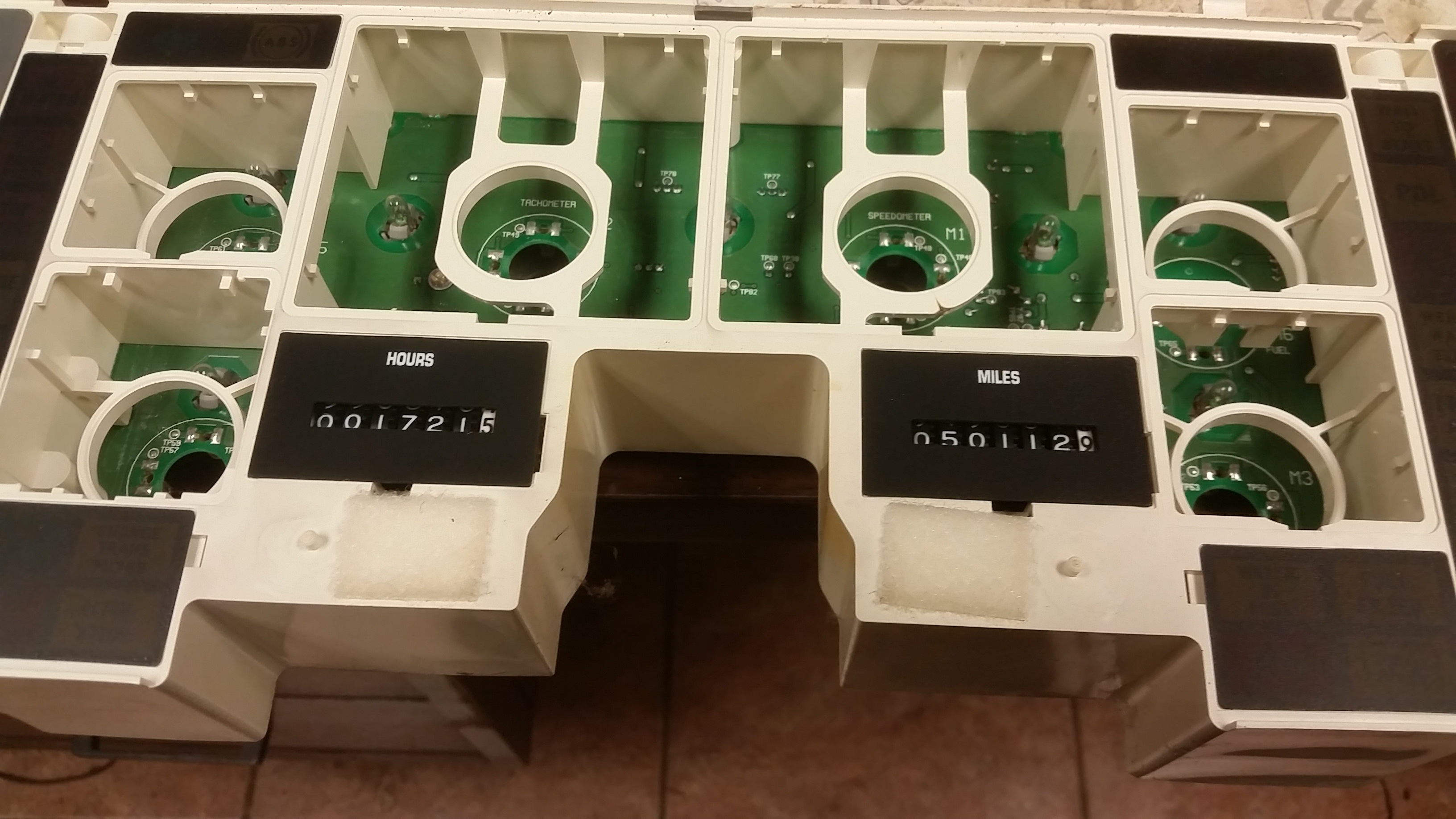 Once all the gauges are removed flip the instrument cluster so that it is face down and remove the metal cover on the back. You should have to remove 6 screws. Once you have the screws removed you should be able to lift the metal cover off the circuit board. There should now be two remaining screws in both top corners of the center circuit board that will need removed. You will also have to unplug two wires. One is for the hours meter and the other is for the odometer. Feed the two wires through the circuit board and remove the circuit board from the rest of the instrument cluster.